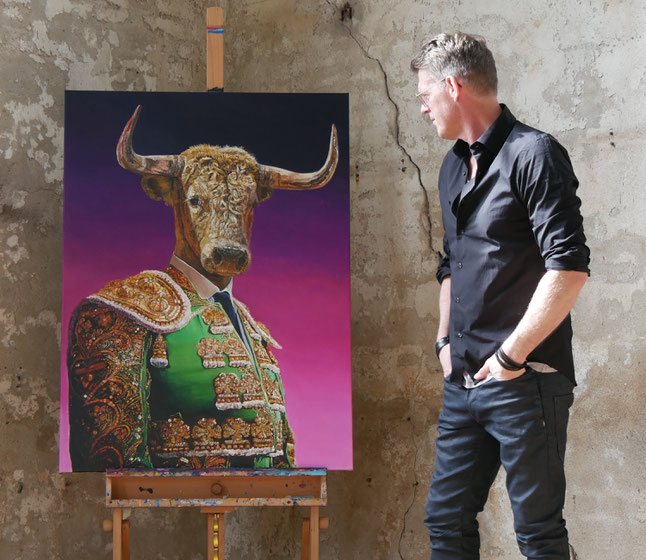 the bulls on large scale canvas. His roots as a Pop Art artist remain visible in his work. Whether you love or hate his work you can't walk pass one and not have an opinion about